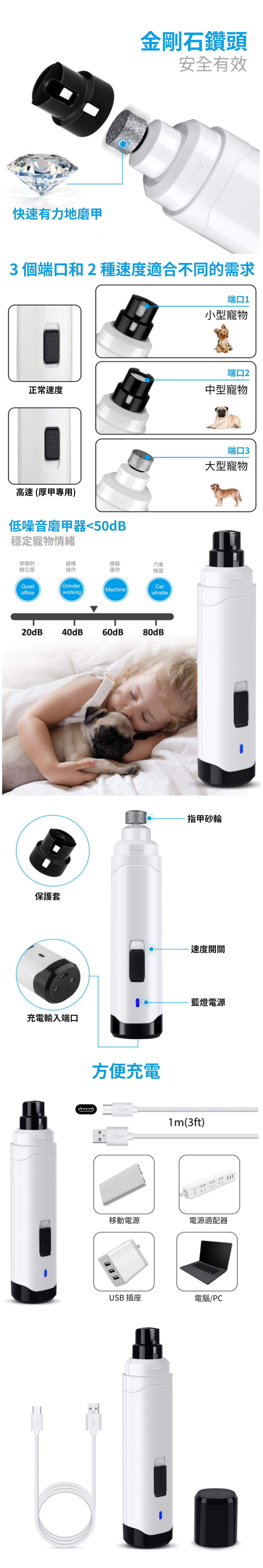 低噪音操作,不會嚇怕寵物。採用超靜音電機,黃銅軸,獨特的靜音技術,輕柔輕柔去除指甲薄層。